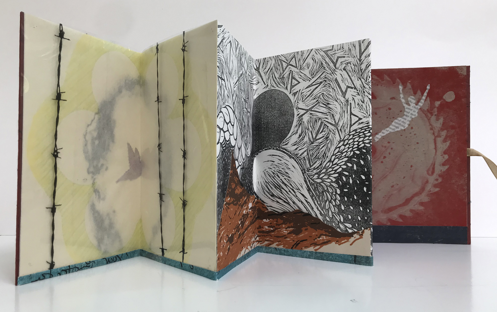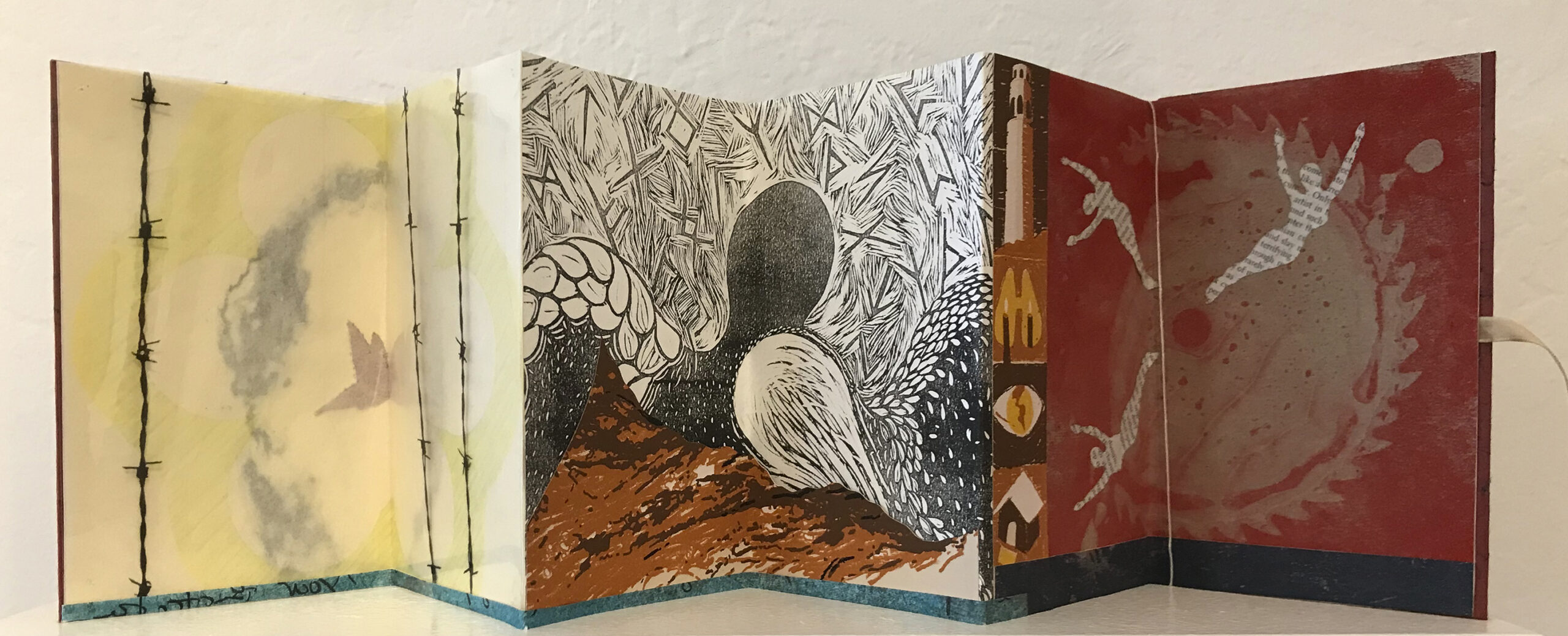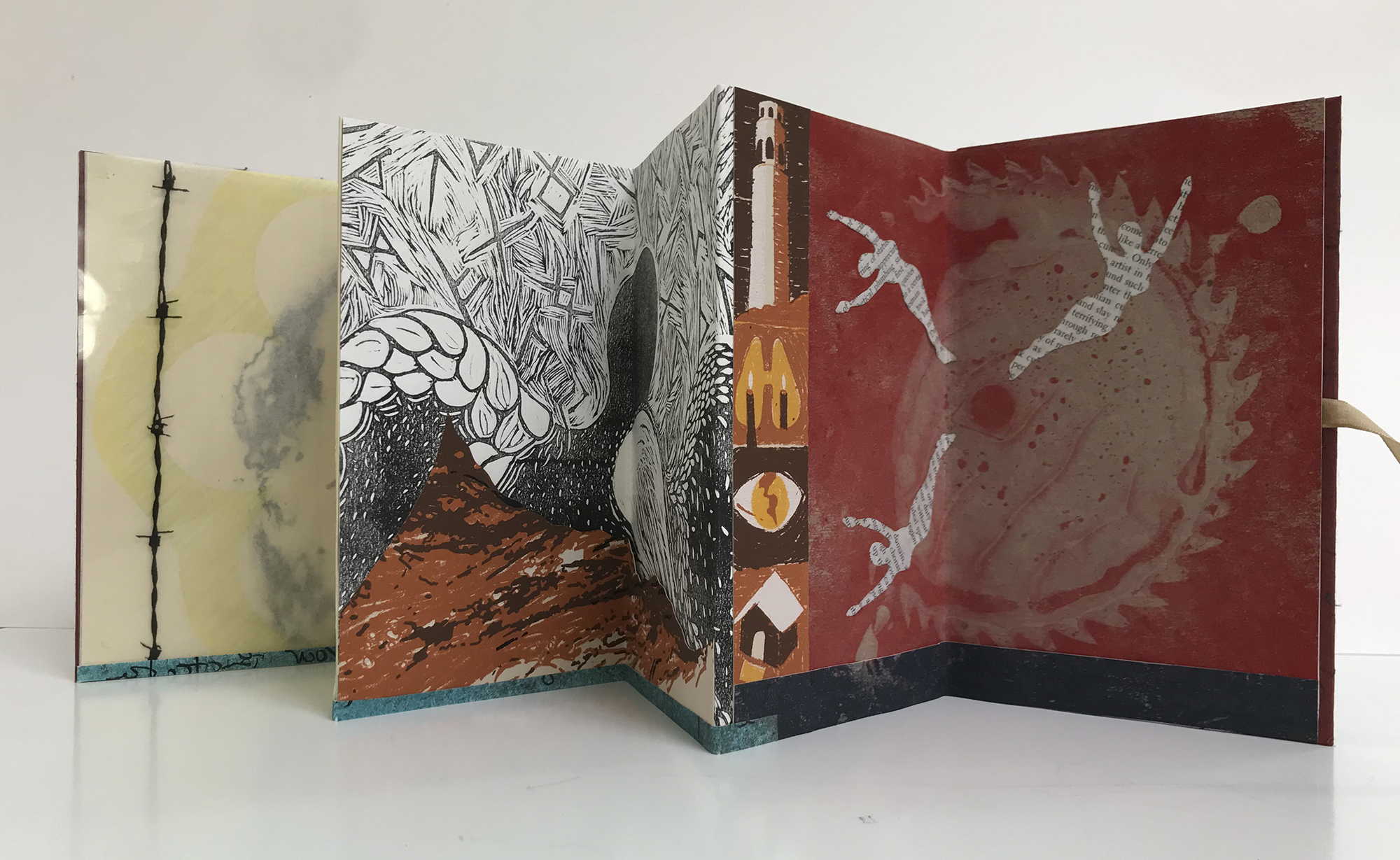 An abstract musing of dreamtimes. Six panel accordion hardcover with ribbon tie.